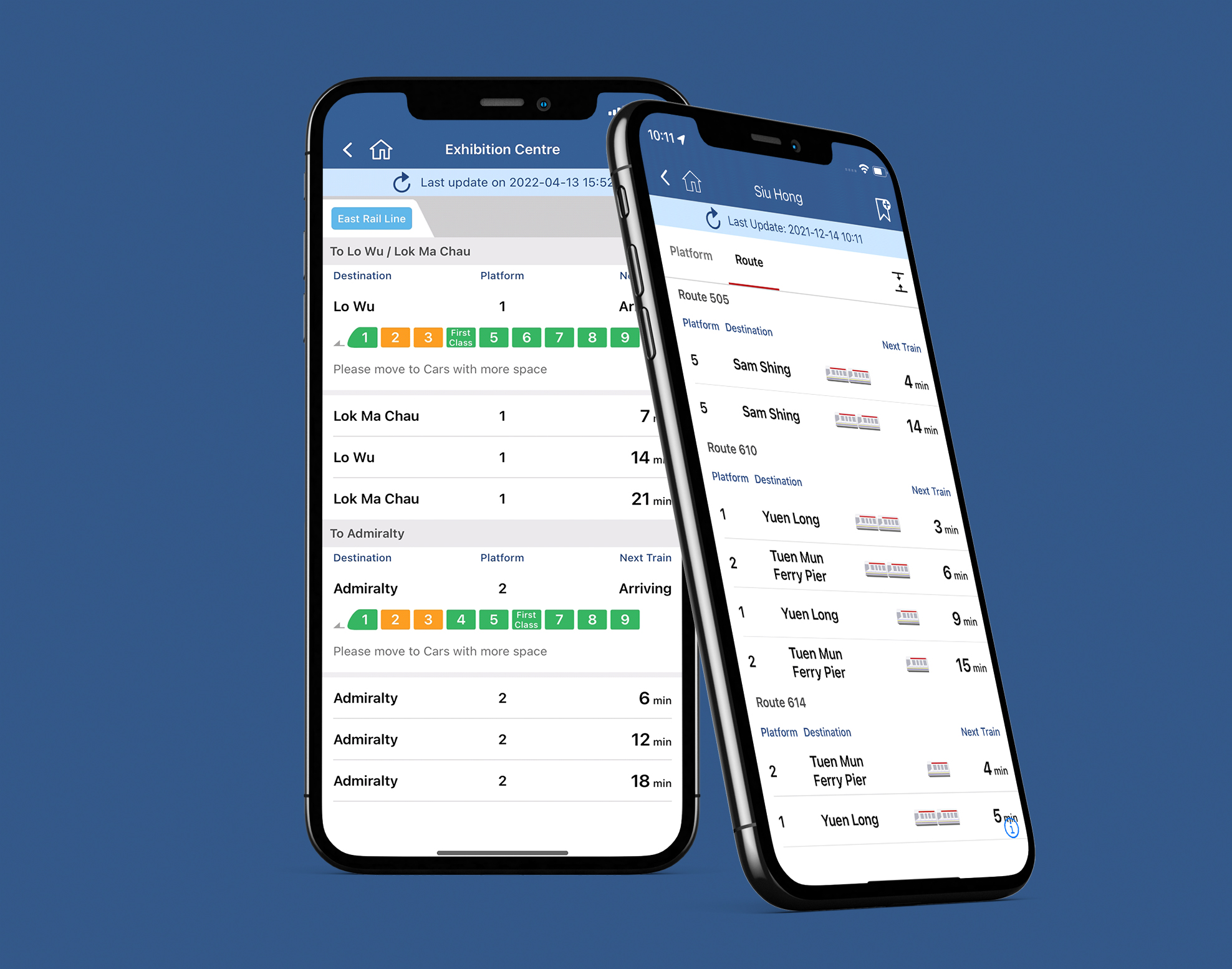 Real-time platform condition and waiting time for the next train for 2 cross-harbour lines are shown in the concourse and platforms of the major interchange station – Admiralty Station. Passengers would be informed and could decide which route to choose.