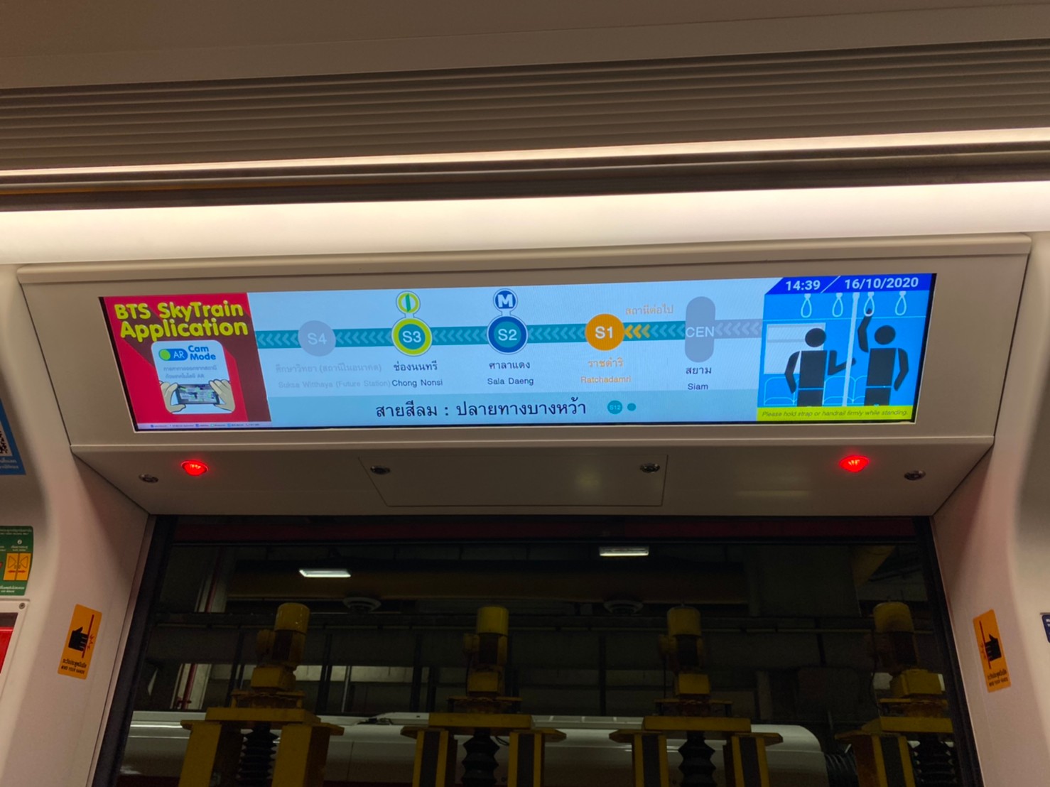 An elongated screen is above the train doors to show the route map and your whereabouts on the railway line. Other messages and announcements could be shown and played too. Approximately 1,500 stretched LEDs connecting to this system are installed in the BTS Skytrains in Thailand. Back to solutions Other Projects