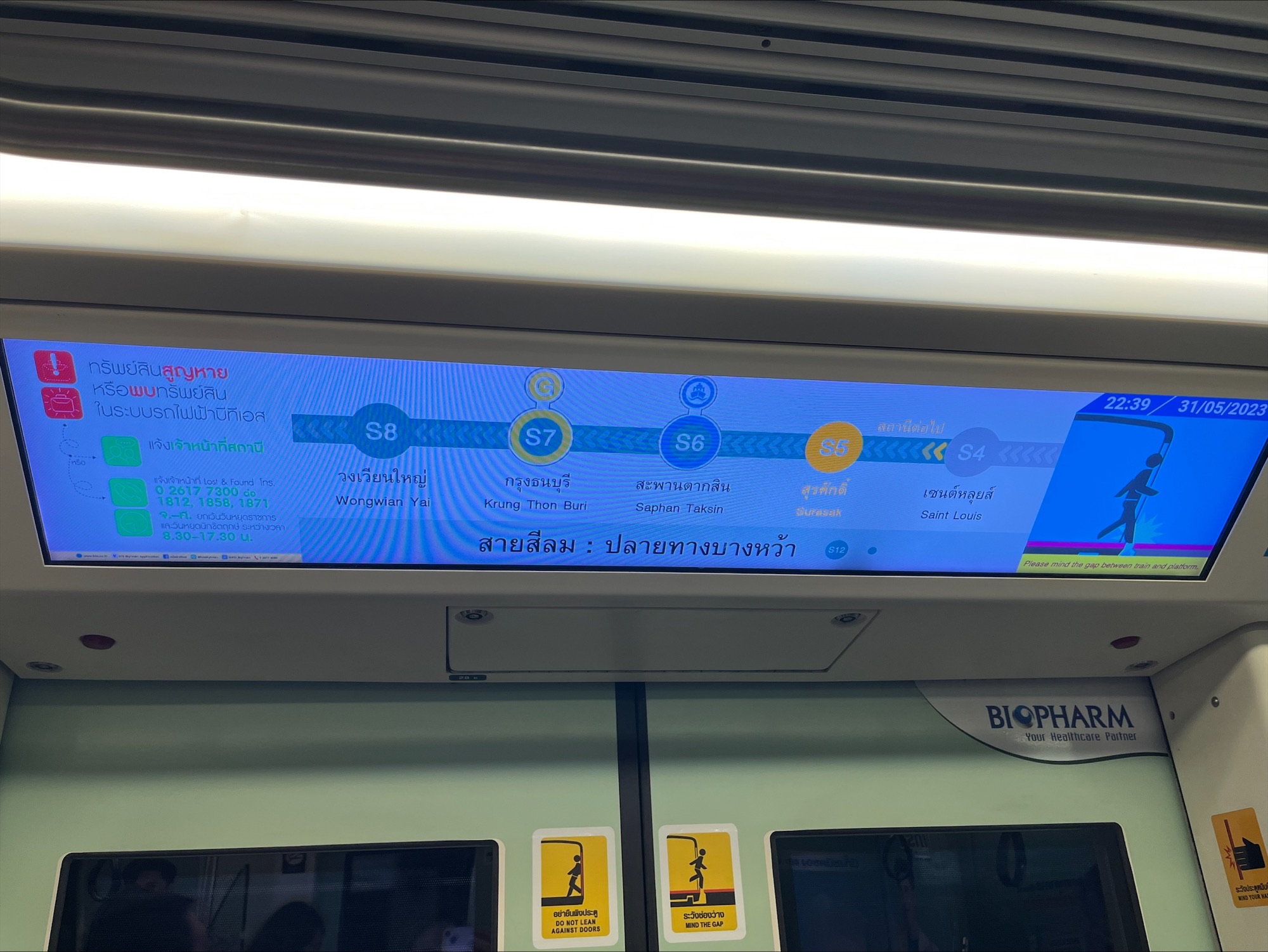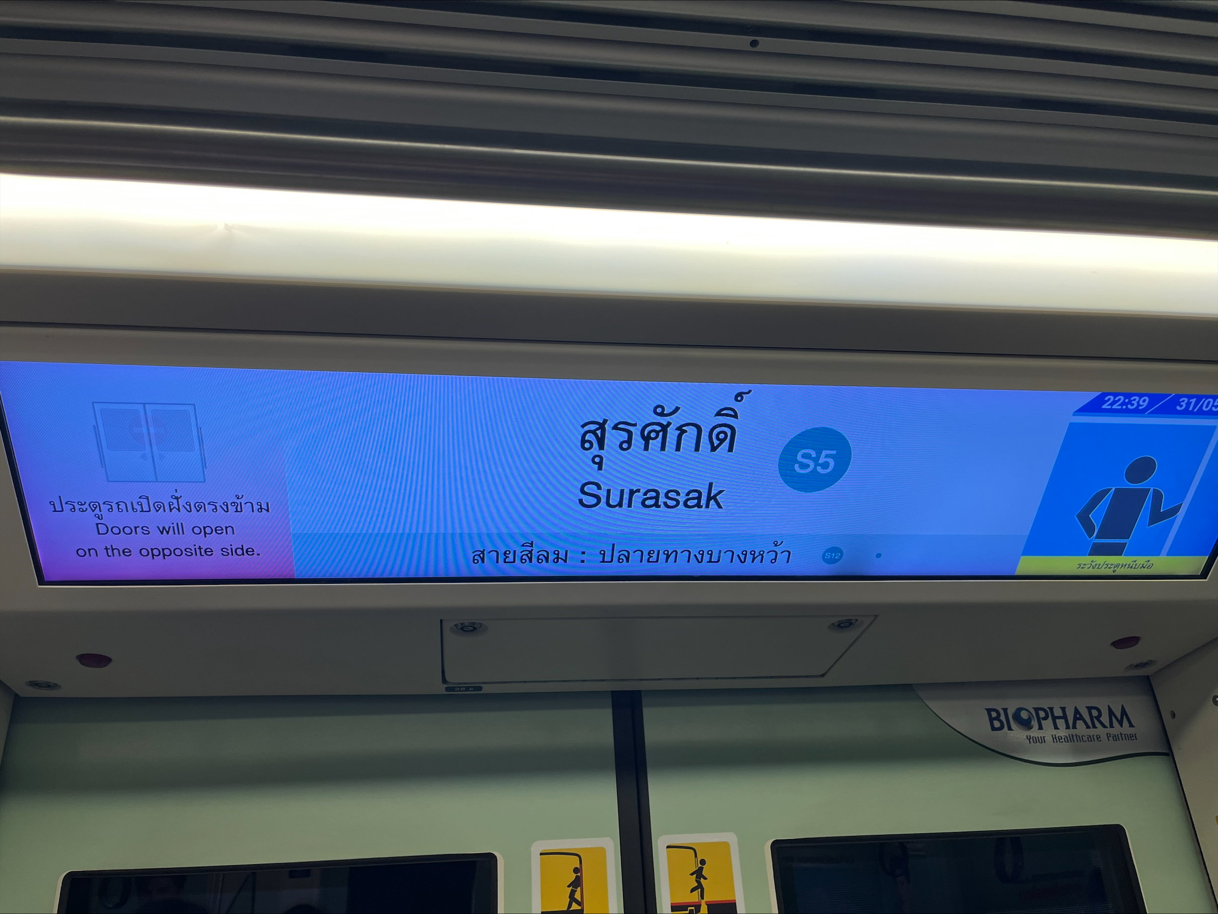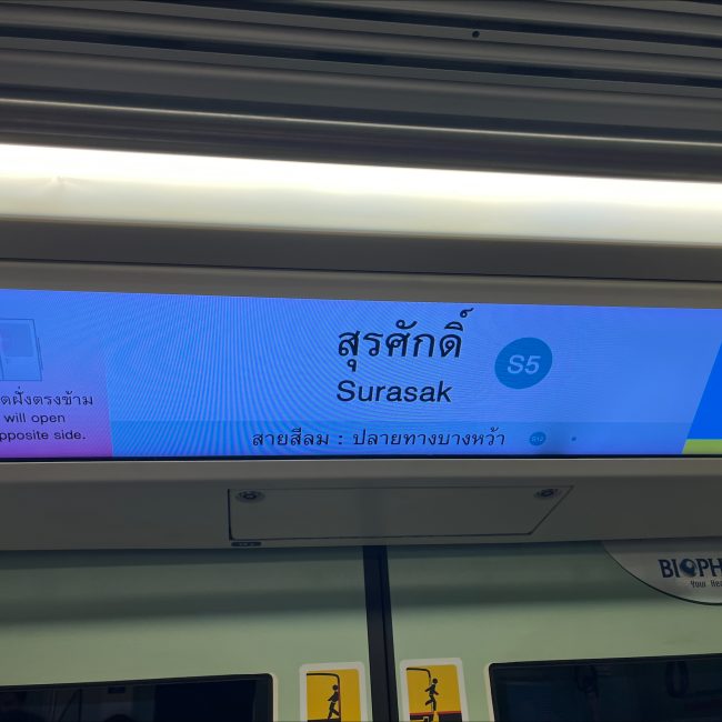 An elongated screen is above the train doors to show the route map and your whereabouts on the railway line. Other messages and announcements could be shown and played too. Approximately 1,500 stretched LEDs connecting to this system are installed in the BTS Skytrains in Thailand.
