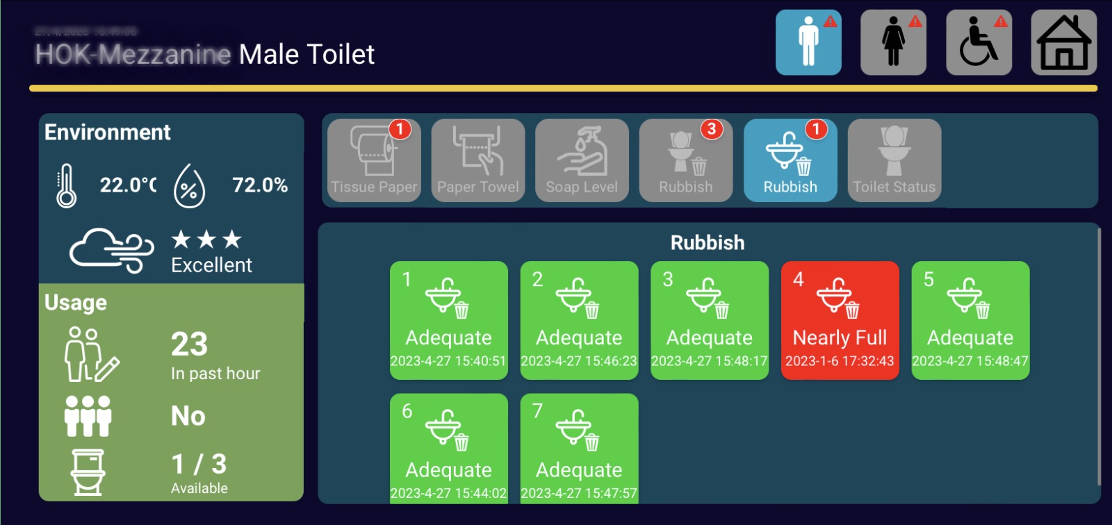 Utilize different kinds of IoT sensors and LoRaWAN technology to monitor washroom environment, quantity of consumables and detect abnormal conditions. If a cubicle is locked for several minutes without movement detected, an alert will be generated. A mobile app is also developed that could show a dashboard of all toilets and cubicles under supervision.